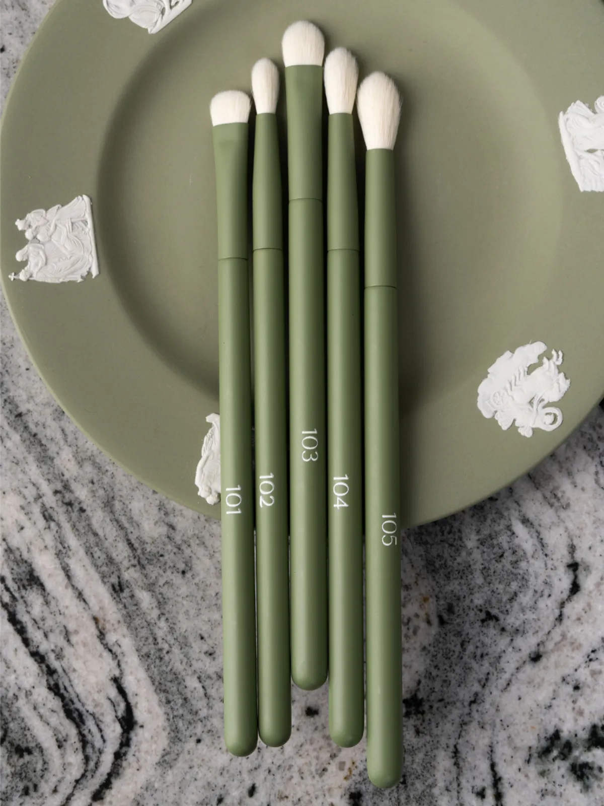 В наборе семь изящных кистей для глаз и лица: 701, 702, 703, 704, 705, 706, 707 и пять утонченных кистей для глаз: 101, 102, 103, 104, 105 с ручками, выполненными в кобальтовом голубом и благородном зелёном оттенке и ворсом цвета слоновой кости по мотивам фарфора Wedgwood.
