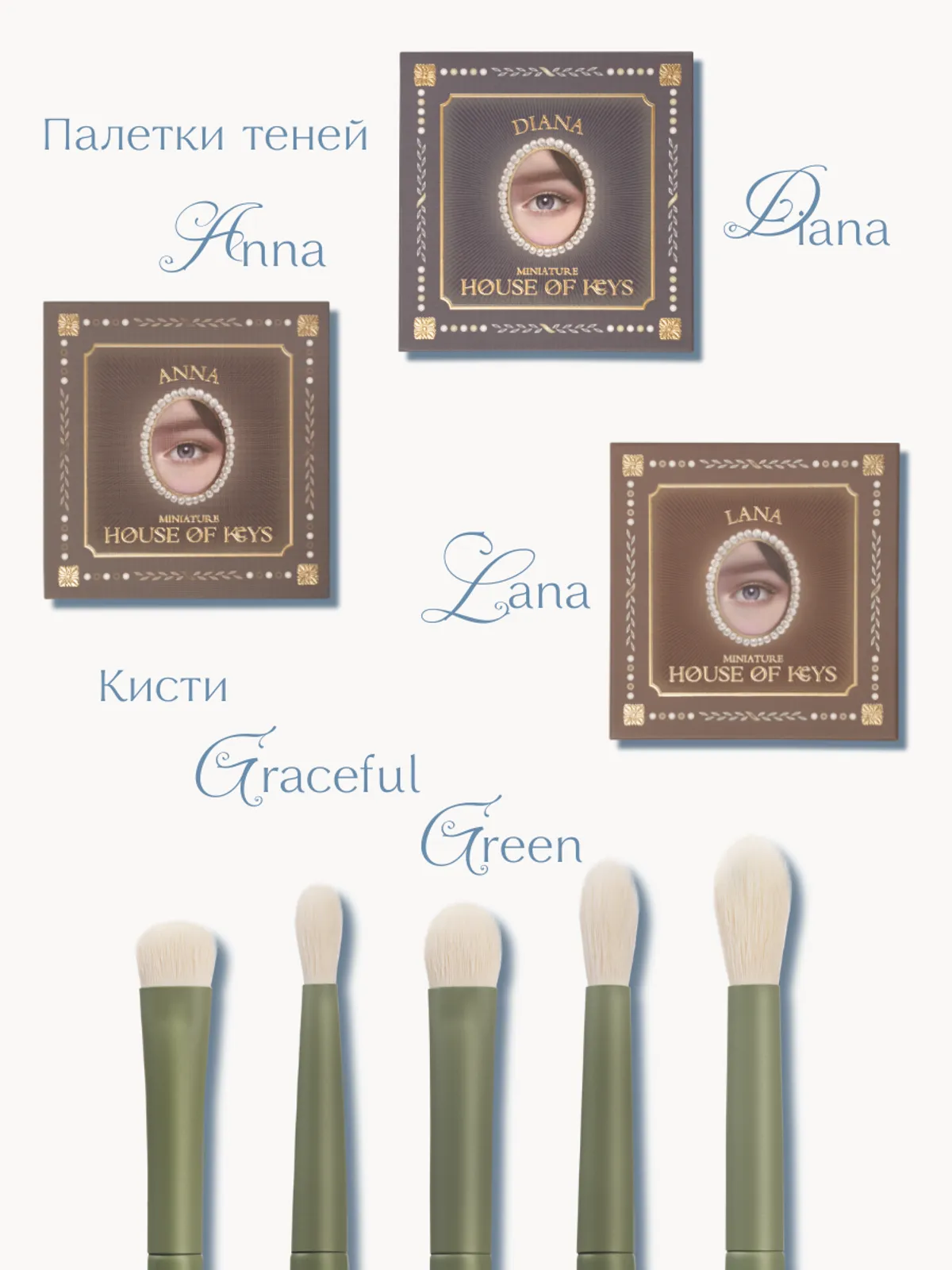 Набор из 5 кистей GRACEFUL GREEN и и трех палеткок теней MINIATURE: ANNA, DIANA, LANA