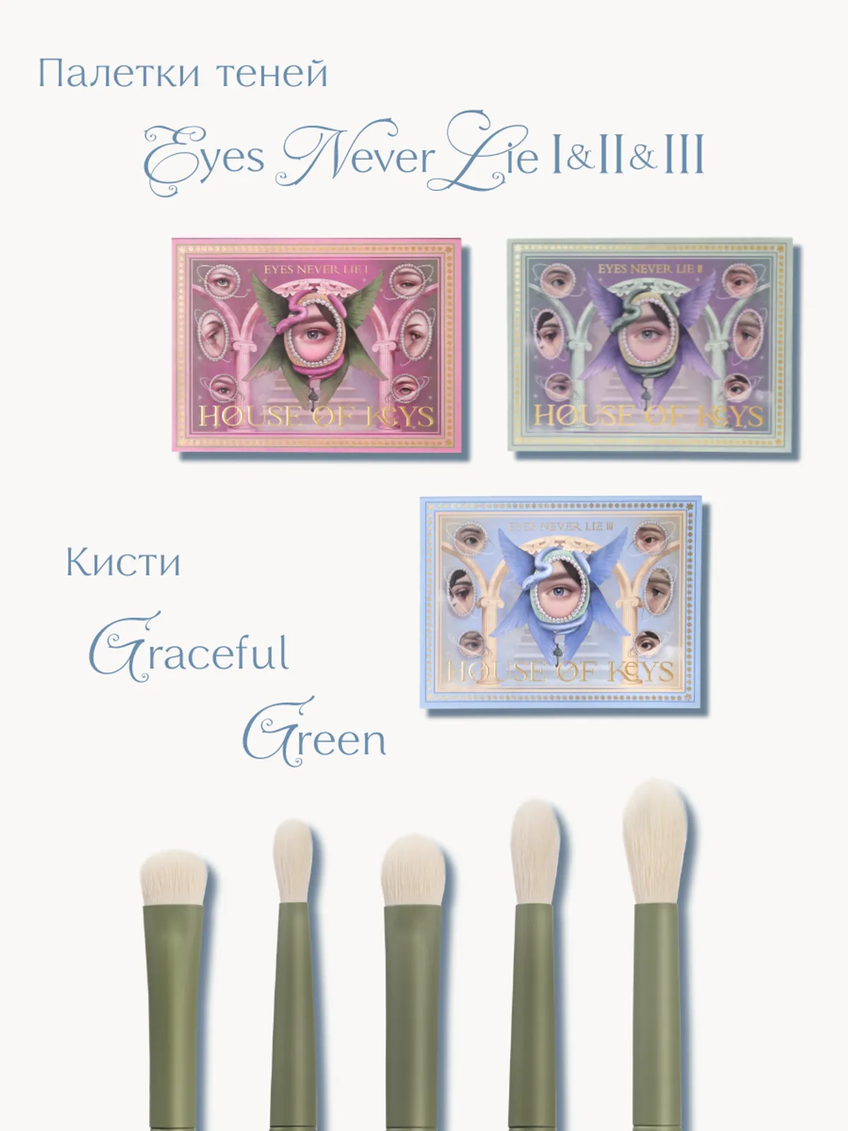 Набор из 5 кистей GRACEFUL GREEN и три палетки теней EYES NEVER LIE часть I, часть II и часть III