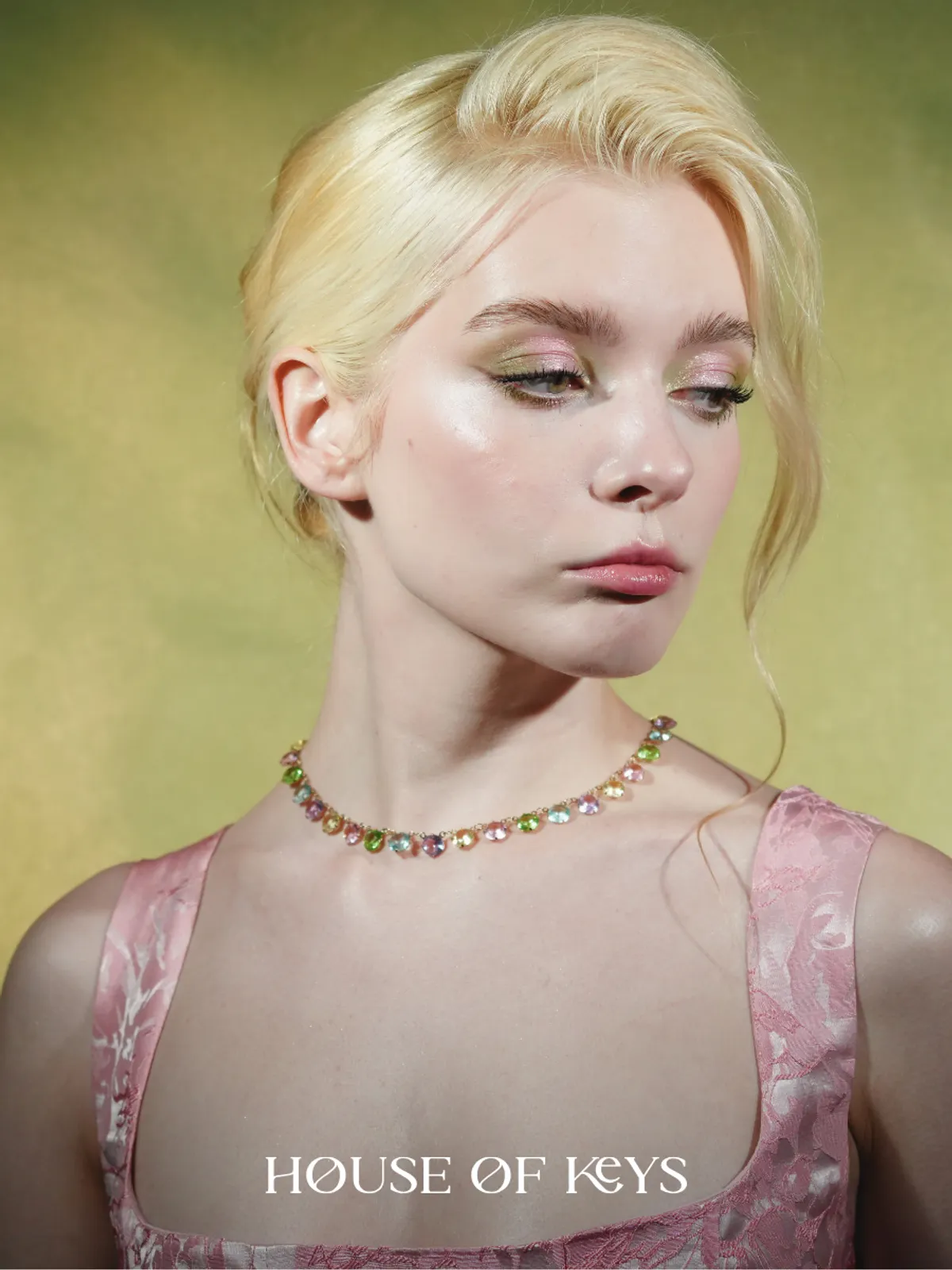 "Metamorphosis" — плотный металлик с переливом из теплого розового в золотистый, с разноцветными блестками