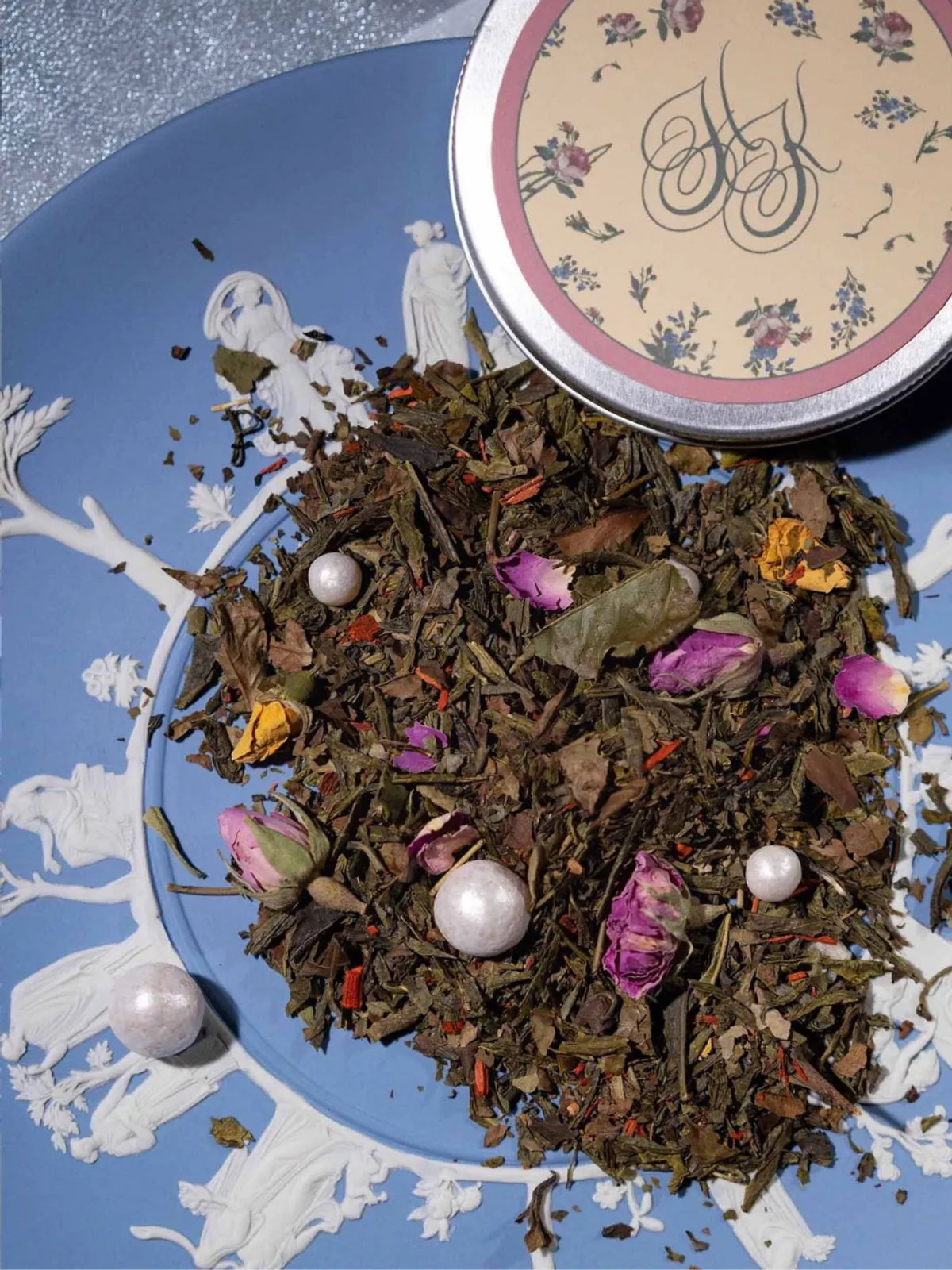 Состав: зеленый китайский чай, кенийский чай, кусочки алоэ, белые бутоны роз, кусочки сандалового дерева, выжимка фрукта соусап, бутоны китайской розы, сахарный жемчуг