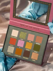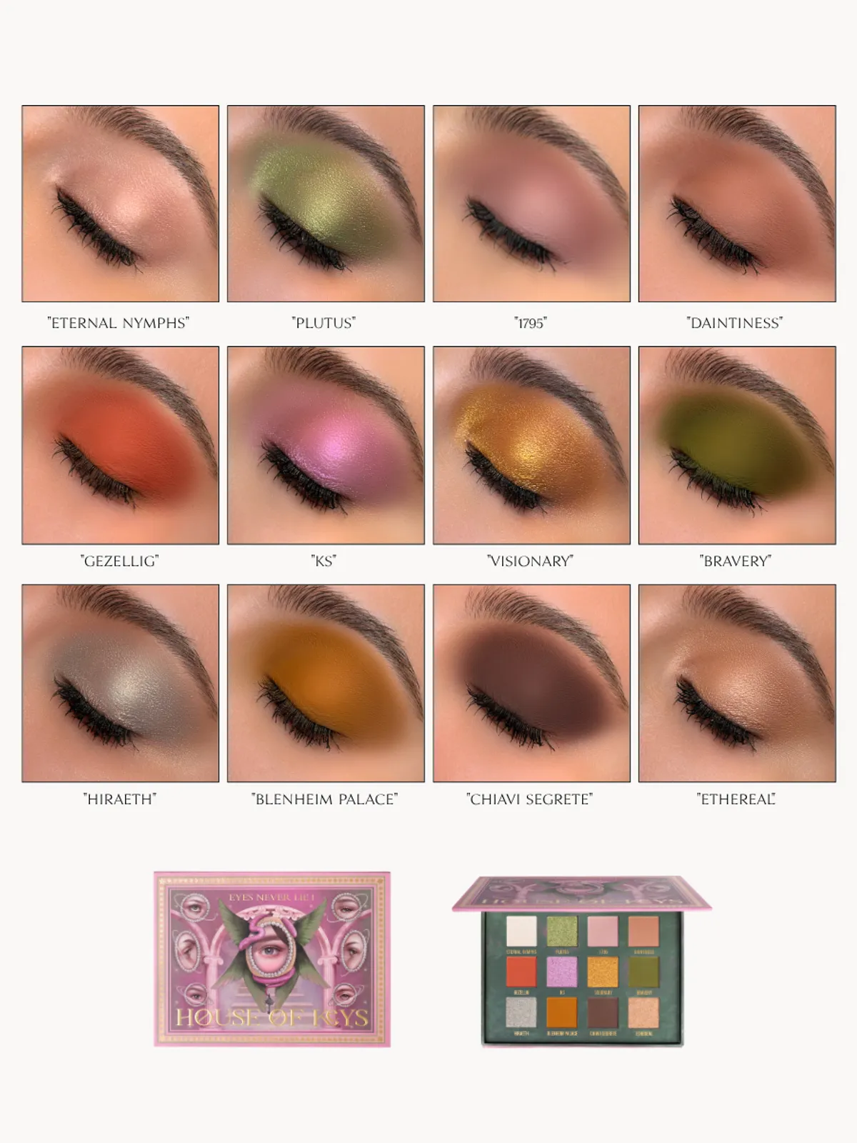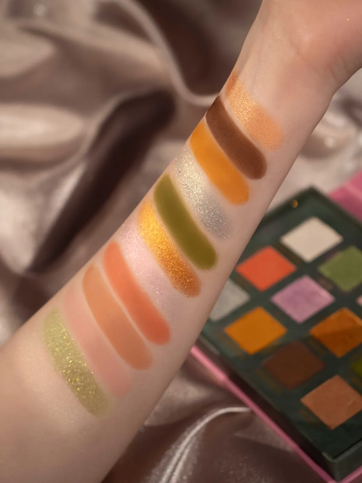 Палетка теней в зелено-золотистой EYES NEVER LIE часть I с сияющими и матовыми оттенками:
